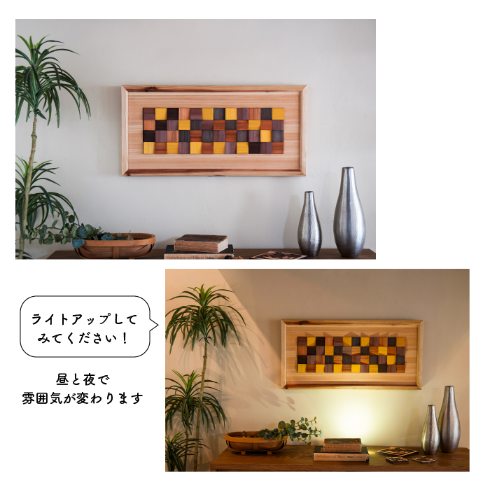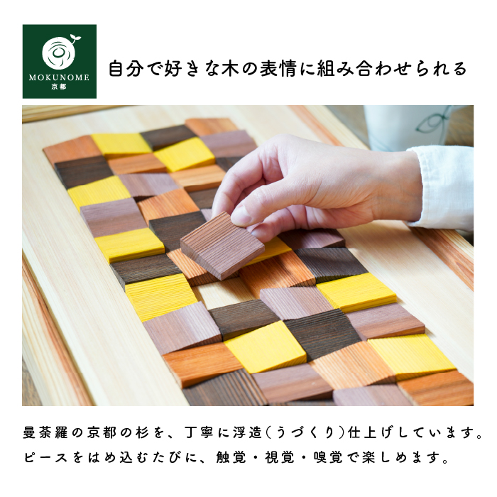ピースの配列や、お気に入りの写真等を工夫することで無限のデザインをお楽しみいただけます。天然木は色合いや木目、節が異なり、時がたつにつれそれらの風合いも変化していきます。天然木ならではの特徴としてお楽しみください。